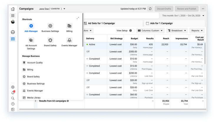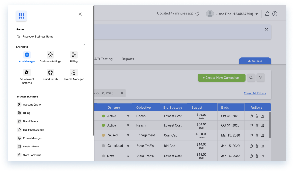 Clearly distinguished from the rest of the content on the screen, the top most navigation section contains Facebook Business’s master navigation menu, the refresh button, profile settings, notifications, and help button.